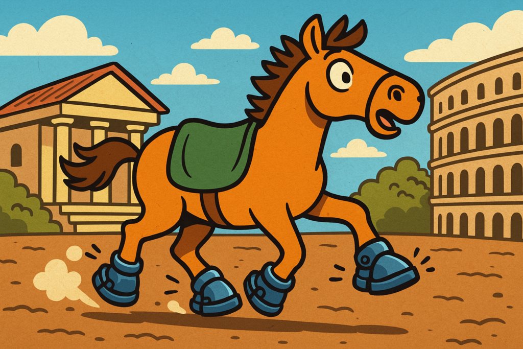蹄鉄のアイデアは、馬が「人類のエンジン」だった古代からスタート。遊牧民は布や皮でカバー、ローマ人は「ヒッポサンダル」という金属製のサンダルを開発。なんだか馬用ナイキみたいですよね。