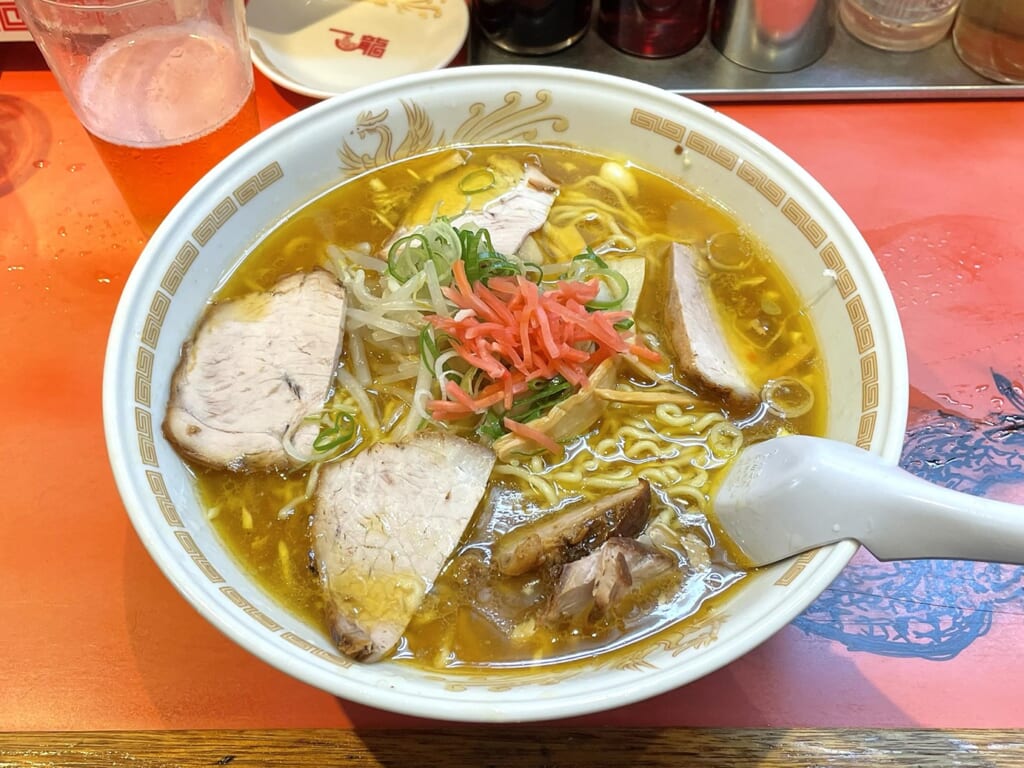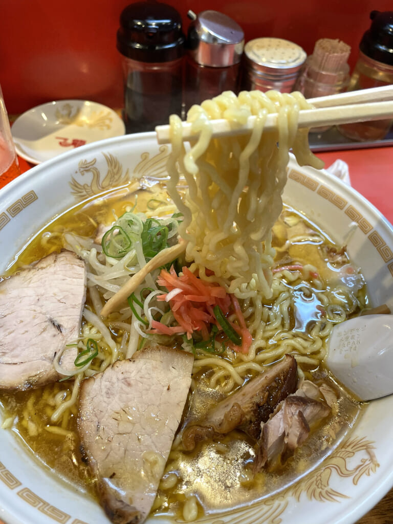 もちもちとした食感のちぢれ麺はスープとの相性抜群で、食べ始めたらもう箸が止まりません。