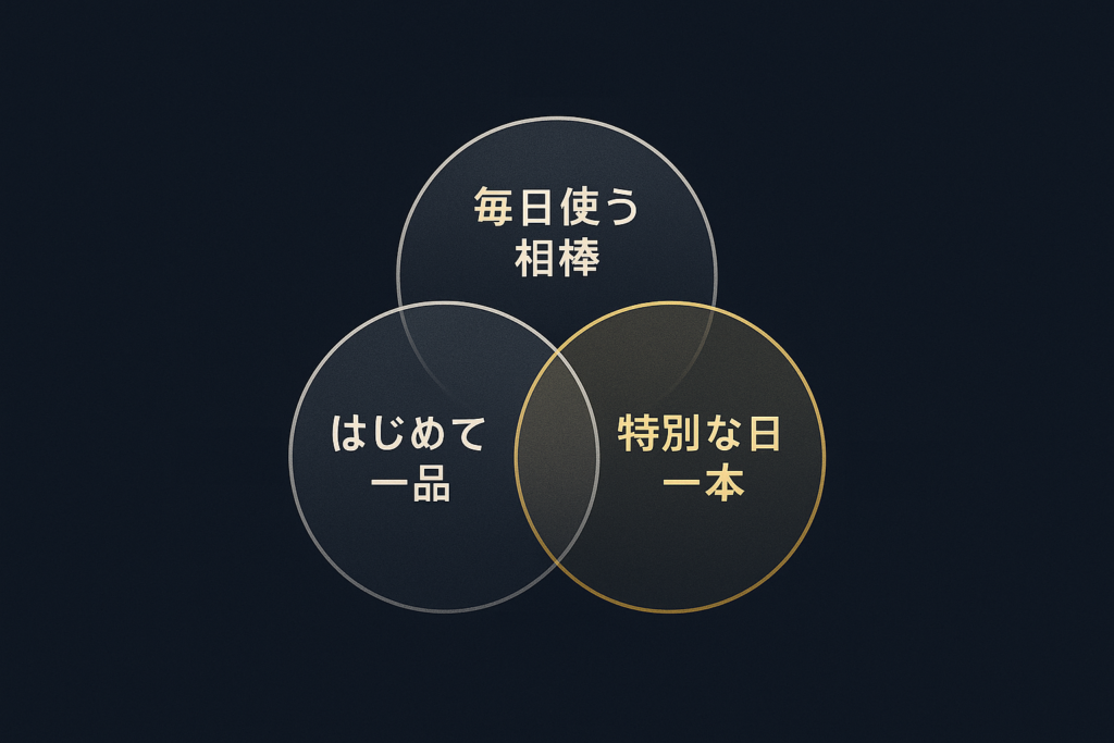 目的をひと言で決める。「毎日使う相棒」「特別な日の一本」「将来も価値が残る一枚」。このどれかに当てはめるだけで、金・銀・プラチナのどれを選ぶか、サイズや重さ、デザインがすっきり決まる。