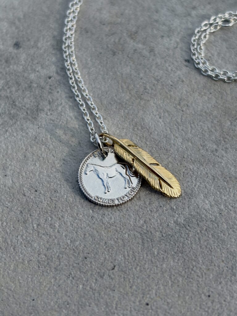 今年の干支にちなんだ馬モチーフのコインと、「飛躍の年になりますように」という願いを込めたフェザーモチーフを重ね付けした、縁起の良いお守り的な組み合わせです。